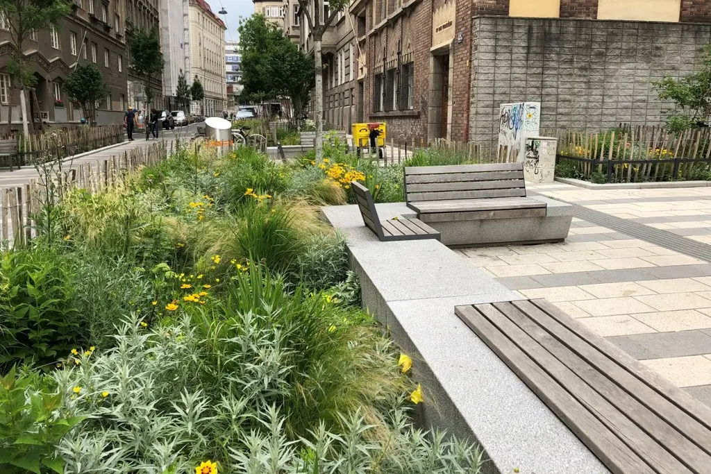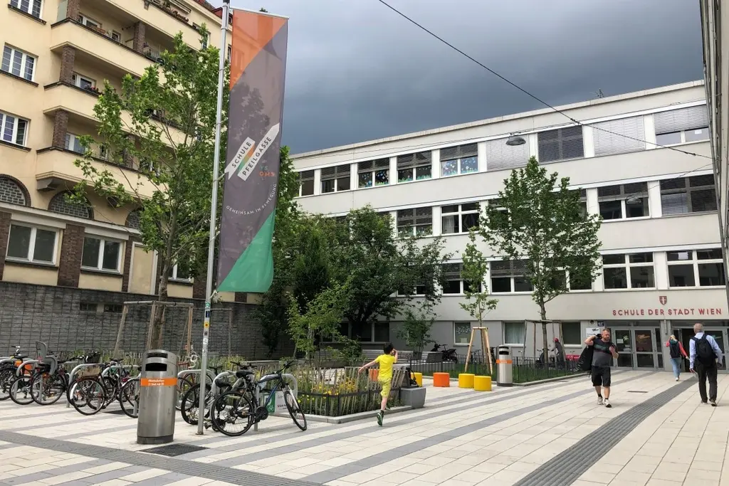 Ein besonders gelungenes Beispiel ist die Umgestaltung der Volksschule Pfeilgasse im Wiener Bezirk Josefstadt. Der umgestaltete Bereich umfasst den ehemaligen Parkplatz für Pädagog:innen, den Lisette-Model-Platz und den dazwischenliegenden Straßenraum zur Pfeilgasse.