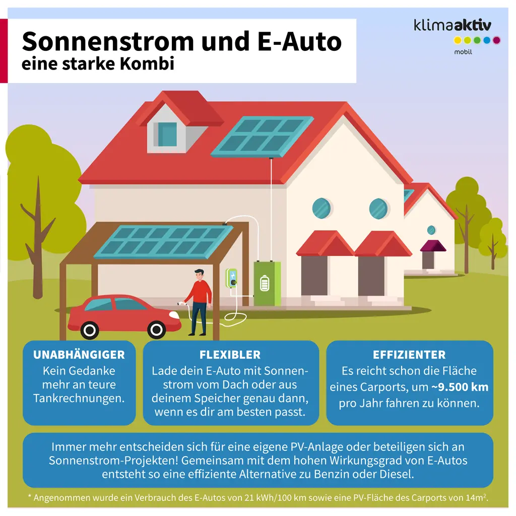 Als Gemeinde ist auch eine Kombination aus eigner Photovoltaikanlage mit E-Auto denkbar – so bleiben Sie unabhängig. Grob reicht dabei bereits eine Fläche eines Carports aus, um im Jahr 9.500 Kilometer fahren zu können.