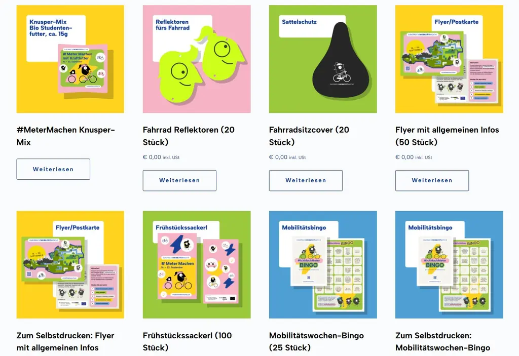 Auf der Website der Europäischen Mobilitätswoche stehen Ihnen zahlreiche Ideen zu Aktionen und Informationen rund um die EMW zur Verfügung. Nach einer Registrierung erhalten Sie zudem Zugang zu kostenlosen Materialien: zum Bestellen und Herunterladen. Drucken Sie beispielsweise das Mobilitätsbingo in der Gemeindezeitung zum Selbstausschneiden und Mitmachen ab – attraktive Preise warten! Bauen Sie Ihr eigenes Periskop und betrachten Sie Ihre Gemeinde durch die Augen eines Kindes. Zeigen Sie mit einer Bilderausstellung, wie sich Ihre Gemeinde positiv verändert hat. Nutzen Sie die Geh-Check-App und laden Sie Mitbürger:innen in Ihre Gemeindegruppe ein, um Problemstellen zu sammeln und zu diskutieren. Knüpfen Sie an bestehende Feste an und erweitern Sie diese um Mobilitätsangebote zum Ausprobieren.