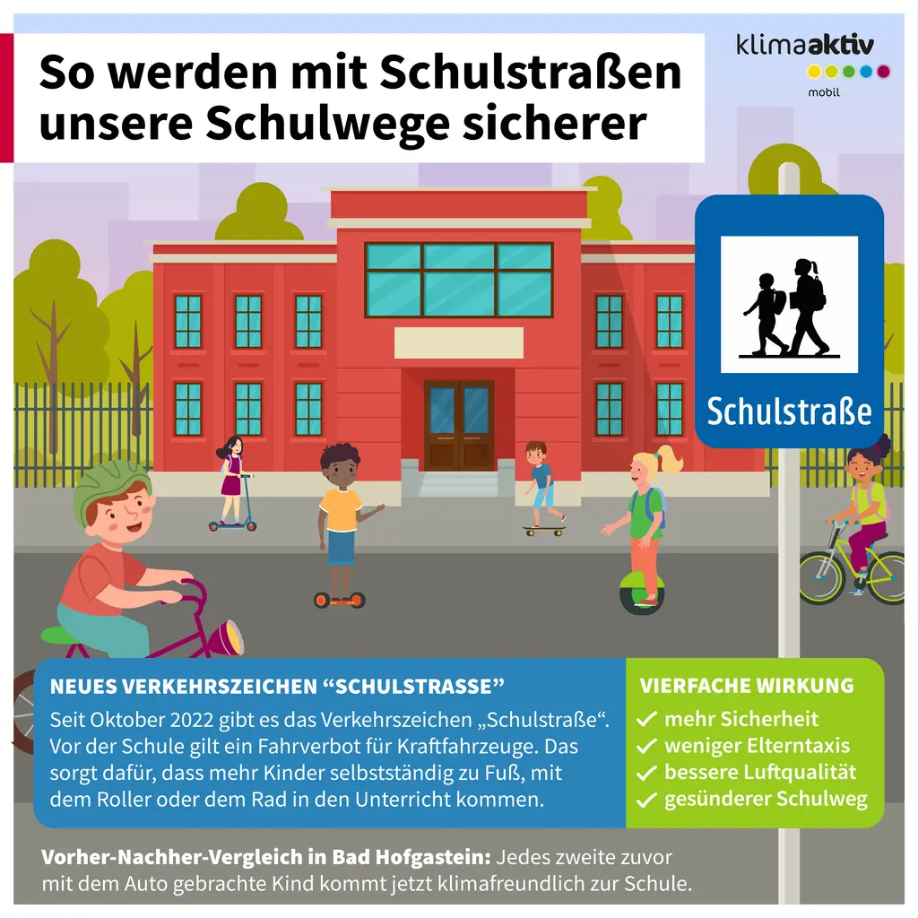 Die Schulstraße ermöglicht es Kindern, aktiv und sicher in die Schule zu kommen. Mit der 33. Novelle der Straßenverkehrsordnung (StVO) im Jahr 2022 wurde die Schulstraße in Österreich gesetzlich verankert.
