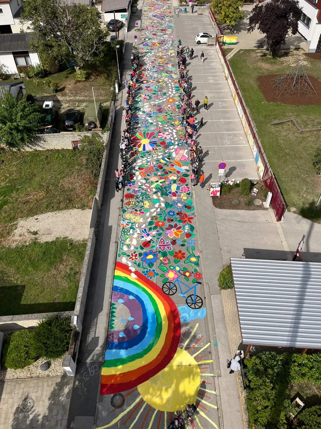 Der Straßenraum ist nicht nur Verkehrsfläche für Autos, sondern auch Lebensraum für uns alle und Schulweg für unsere Kinder. Um darauf aufmerksam zu machen, gestalten Kinder die Straßen und schmücken diese mit Kunstwerken. Statt grauem Beton und Asphalt entstehen Malereien etwa von Blumen, Wiesen, Bäumen, Tieren oder Teichen.
