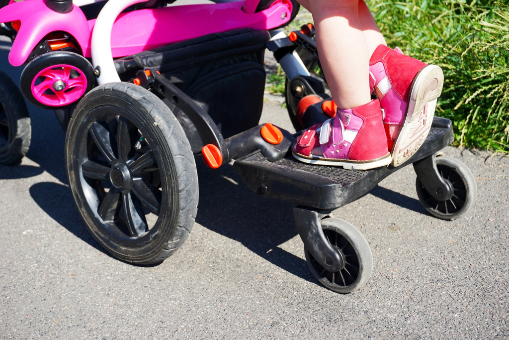 Ein zweites Kind kann auf einem Kiddy-Board - einem Trittbrett, das am Kinderwagen befestigt wird - mitfahren. Wird das Board nicht benötigt, kann es einfach hochgeklappt und mit einem Gurt am Kinderwagen befestigt werden. Kiddy-Boards sind für Kinder im Alter von etwa 18 Monaten bis fünf Jahren geeignet. Sind Sie häufig mit öffentlichen Verkehrsmitteln unterwegs, achten Sie auf eine maximale Breite des Kinderwagens von 61 cm.